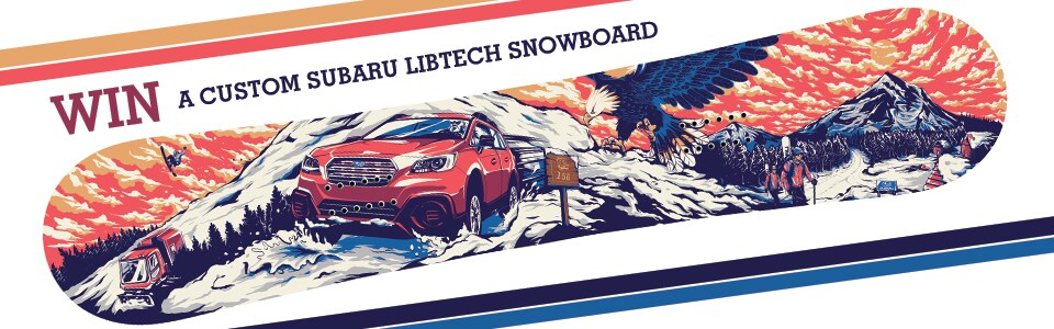 Prize: Prize provided by LibTech and is valued at $573. No cash or other prize substitution permitted except at Sponsor's discretion. The prize is nontransferable. Any and all prize related expenses, including without limitation any and all federal, state, and/or local taxes shall be the sole responsibility of the winner. No substitution of prize or transfer/assignment of prize to others or request for the cash equivalent by winners is permitted. Acceptance of prize constitutes permission for Subaru to use winner's name, likeness, and entry for purposes of advertising and trade without further compensation, unless prohibited by law.
