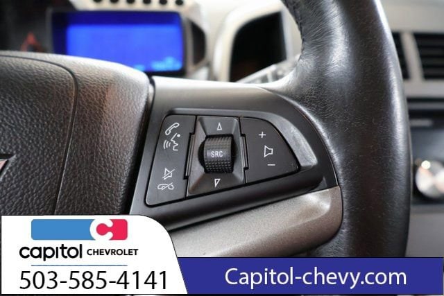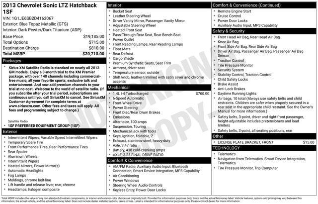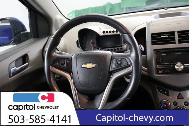 We Buy cars- Fast, Fair and Easy This 2013 Blue Topaz Metallic Chevrolet Sonic LTZ FWD is well equipped and includes these features and benefits: Preferred Equipment Group 1SF, Heated front seats, 17 Painted Aluminum Wheels, 6 Speakers, ABS brakes, Air Conditioning, Alloy wheels, AM/FM radio: SiriusXM, Brake assist, Bumpers: body-color, Compass, Delay-off headlights, Driver door bin, Driver vanity mirror, Dual front impact airbags, Dual front side impact airbags, Electronic Stability Control, Emergency communication system: OnStar Directions & Connections, Front anti-roll bar, Front Bucket Seats, Front fog lights, Front License Plate Bracket, Front reading lights, Front wheel independent suspension, Fully automatic headlights, Heated door mirrors, Heated Front Bucket Seats, Illuminated entry, Knee airbag, Low tire pressure warning, Occupant sensing airbag, Outside temperature display, Overhead airbag, Panic alarm, Passenger door bin, Passenger vanity mirror, Perforated Leatherette Seating Surfaces, Power door mirrors, Power steering, Power windows, Premium 6-Speaker Audio System Feature, Radio data system, Radio: Chevrolet MyLink AM/FM Stereo, Rear side impact airbag, Rear window defroster, Rear window wiper, Remote keyless entry, Security system, SiriusXM Satellite Radio, Speed control, Split folding rear seat, Spoiler, Sport steering wheel, Steering wheel mounted audio controls, Tachometer, Telescoping steering wheel, Tilt steering wheel, Traction control, Trip computer, USB Port, and Variably intermittent wipers.