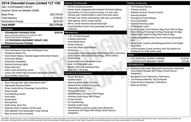 We Buy cars- Fast, Fair and Easy This 2016 Silver Ice Metallic Chevrolet Cruze Limited 1LT FWD is well equipped and includes these features and benefits: Preferred Equipment Group 1SD, Technology Package (6 Speaker Audio System Feature, Chevrolet MyLink, Radio: Chevrolet MyLink AM/FM Stereo w/CD Player, Rear Vision Camera, SiriusXM Satellite Radio, and USB Port Audio Interface Delete), 16 Painted Aluminum Wheels, 6 Speakers, 6-Way Manual Driver Seat Adjuster, ABS brakes, Air Conditioning, Alloy wheels, AM/FM radio: SiriusXM, AM/FM Stereo w/CD Player/MP3 Playback, Brake assist, Bumpers: body-color, CD player, Chrome Door Sill Plates (LPO), Compass, Delay-off headlights, Driver door bin, Driver vanity mirror, Dual front impact airbags, Dual front side impact airbags, Electronic Stability Control, Emergency communication system: OnStar, Front anti-roll bar, Front Bucket Seats, Front Center Armrest, Front License Plate Bracket, Front Passenger 6-Way Manual Seat Adjuster, Front reading lights, Front wheel independent suspension, Fully automatic headlights, Illuminated entry, Knee airbag, Low tire pressure warning, Occupant sensing airbag, Outside temperature display, Overhead airbag, Panic alarm, Passenger door bin, Passenger vanity mirror, Power door mirrors, Power steering, Power windows, Premium Cloth Seat Trim, Radio data system, Rear seat center armrest, Rear side impact airbag, Rear window defroster, Remote keyless entry, Security system, Speed control, Speed-sensing steering, Split folding rear seat, Steering wheel mounted audio controls, Tachometer, Telescoping steering wheel, Tilt steering wheel, Traction control, Trip computer, Variably intermittent wipers, and Voltmeter.