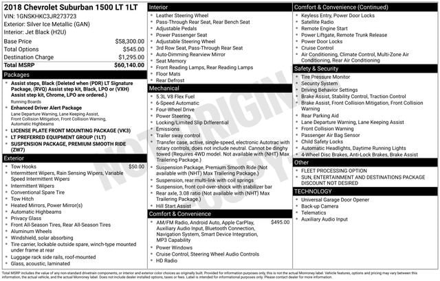 We Buy cars- Fast, Fair and Easy This 2018 Silver Ice Metallic Chevrolet Suburban LT 4WD is well equipped and includes these features and benefits: Enhanced Driver Alert Package (Lane Keep Assist w/Lane Departure Warning, Forward Collision Alert, Intellibeam Headlamps w/Automatic High Beam On/Off, Low Speed Forward Automatic Braking, and Safety Alert Seat), License Plate Front Mounting Package, Preferred Equipment Group 1LT (Rear Park Assist w/Audible Warning, 12-Volt Auxiliary Power Outlet (5), 1st & 2nd Row Color-Keyed Carpeted Floor Mats, 2nd Row 60/40 Split-Folding Manual Bench, 3rd Row Manual 60/40 Split-Folding Fold Flat Bench, 4-Wheel Antilock Disc Brakes, 6-Way Power Front Passenger Seat Adjuster, Auto-Dimming Inside Rear-View Mirror, Black Assist Steps, Bose Premium Audio System Feature, Color-Keyed Carpeting Floor Covering, Driver Inboard & Front Passenger Airbags, Electronic Cruise Control w/Set & Resume Speed, Extended-Range Remote Keyless Entry, Floor Console w/Storage Area, HD Radio, Leather-Wrapped Steering Wheel, Memory Settings, OnStar Basic Plan For 5 Years, Power Liftgate, Power-Adjustable Accelerator & Brake Pedals, Remote Vehicle Start, Roof-Mounted Luggage Rack Side Rails, SiriusXM Satellite Radio, and Universal Home Remote), Premium Smooth Ride Suspension Package, Apple CarPlay/Android Auto, Auto High-beam Headlights, Exterior Parking Camera Rear, Rain sensing wipers, 18 x 8.5 High-Polished Aluminum Finish Wheels, 2 Front Frame-Mounted Black Recovery Hooks, 3.08 Rear Axle Ratio, 3rd row seats: split-bench, 4-Wheel Disc Brakes, 9 Speakers, ABS brakes, Adjustable pedals, Air Conditioning, Alloy wheels, AM/FM radio: SiriusXM, Auto-dimming Rear-View mirror, Automatic temperature control, Brake assist, Bumpers: body-color, CD player, Compass, Delay-off headlights, Driver door bin, Driver vanity mirror, Dual front impact airbags, Dual front side impact airbags, Electronic Stability Control, Emergency communication system: OnStar Guidance, Front anti-roll bar, Front Bucket Seats, Front Center Armrest, Front dual zone A/C, Front reading lights, Front wheel independent suspension, Fully automatic headlights, Garage door transmitter, Heated door mirrors, Heated Front Reclining Bucket Seats, Heated front seats, Illuminated entry, Leather-Appointed Seat Trim, Low tire pressure warning, Memory seat, Occupant sensing airbag, Outside temperature display, Overhead airbag, Overhead console, Panic alarm, Passenger door bin, Passenger vanity mirror, Pedal memory, Power door mirrors, Power driver seat, Power passenger seat, Power steering, Power windows, Radio: Chevrolet MyLink AM/FM Stereo, Radio: Chevrolet MyLink AM/FM Stereo w/Navigation, Rear air conditioning, Rear anti-roll bar, Rear reading lights, Rear seat center armrest, Rear window defroster, Rear window wiper, Remote keyless entry, Roof rack: rails only, Security system, Single-Slot CD/MP3 Player, SiriusXM NavTraffic, Speed control, Speed-sensing steering, Split folding rear seat, Spoiler, Steering wheel mounted audio controls, Tachometer, Telescoping steering wheel, Tilt steering wheel, Traction control, Trip computer, Variably intermittent wipers, and Voltmeter.