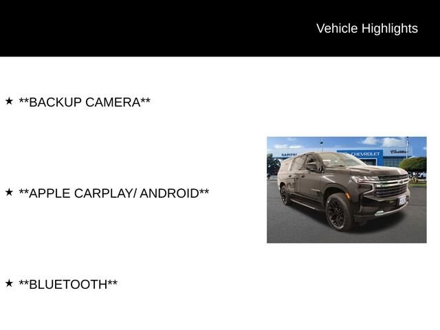 We Buy cars- Fast, Fair and Easy This 2021 Black Chevrolet Suburban LT 4WD is well equipped and includes these features and benefits: License Plate Front Mounting Package, Preferred Equipment Group 1LT (10-Way Power Driver & Passenger Seat Adjusters, 1st & 2nd Row Color-Keyed Carpeted Floor Mats, 2 USB Data Ports, Auto-Dimming Inside Rear-View Mirror, Bose 9-Speaker Stereo Audio System Feature, Bright Front & Rear Door Sill Plates, Color-Keyed Carpeting Floor Covering, Driver & Front Outboard Passenger Airbags, Floor Console w/Storage Area, Hands-Free Rear Power Programmable Liftgate, HD Radio, Heated Driver & Front Passenger Seats, Infotainment Display, Leather-Wrapped Steering Wheel, LED Daytime Running Lamps, Memory Settings For Driver, Remote Start, SiriusXM Radio w/360L, and Universal Home Remote), 1st & 2nd Rows All-Weather Floor Liners (LPO), 3.23 Rear Axle Ratio, 3rd row seats: split-bench, 4-Wheel Disc Brakes, 9 Speakers, ABS brakes, Air Conditioning, Alloy wheels, AM/FM radio: SiriusXM with 360L, Apple CarPlay/Android Auto, Auto High-beam Headlights, Auto-dimming Rear-View mirror, Automatic temperature control, Black Roof Rack Cross Rails, Brake assist, Bumpers: body-color, Compass, Delay-off headlights, Driver door bin, Driver vanity mirror, Dual front impact airbags, Dual front side impact airbags, Electronic Stability Control, Emergency communication system: OnStar and Chevrolet connected services capable, Four wheel independent suspension, Front & Rear Black Bowtie Emblems (LPO), Front anti-roll bar, Front Bucket Seats, Front Center Armrest, Front dual zone A/C, Front reading lights, Fully automatic headlights, Garage door transmitter, Heated door mirrors, Heated front seats, Illuminated entry, Leather Seating Surfaces, Leather steering wheel, Low tire pressure warning, Memory seat, Molded Splash Guards, Not Equipped w/Automatic Stop/Start, Not Equipped w/Steering Column Lock, Not Equipped w/Wireless Charging, Occupant sensing airbag, Outside temperature display, Overhead airbag, Overhead console, Panic alarm, Passenger door bin, Passenger vanity mirror, Power door mirrors, Power driver seat, Power Liftgate, Power passenger seat, Power steering, Power windows, Premium audio system: Chevrolet Infotainment 3 Plus, Premium Smooth Ride Suspension, Radio: Chevrolet Infotainment 3 Plus System, Rain sensing wipers, Rear air conditioning, Rear anti-roll bar, Rear reading lights, Rear seat center armrest, Rear window defroster, Rear window wiper, Remote keyless entry, Roof rack: rails only, Security system, Speed control, Speed-sensing steering, Split folding rear seat, Spoiler, Steering wheel mounted audio controls, Tachometer, Telescoping steering wheel, Tilt steering wheel, Traction control, Trip computer, Variably intermittent wipers, Voltmeter, and Wheels: 18 x 8.5 Bright Silver Painted Aluminum.