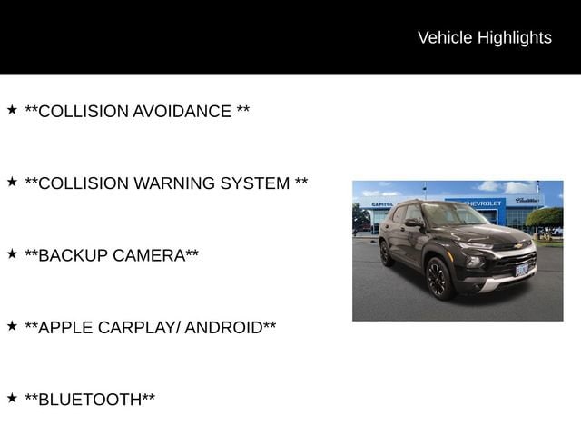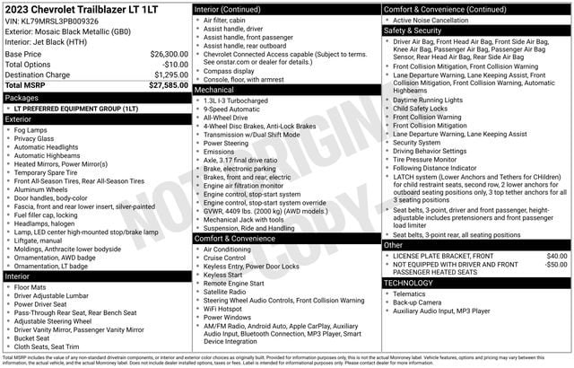 We Buy cars- Fast, Fair and Easy This 2023 Mosaic Black Metallic Chevrolet TrailBlazer LT AWD is well equipped and includes these features and benefits: Preferred Equipment Group 1LT, 2-Way Adjustable Front Head Restraints, 2-Way Power Driver Lumbar Seat Adjuster, 3.17 Axle Ratio, 4-Way Manual Front Passenger Seat Adjuster, 4-Wheel Disc Brakes, 6 Speakers, 6-Speaker Audio System Feature w/Amplifier, 7 Diagonal Color Touchscreen, 8-Way Power Driver Seat Adjuster, ABS brakes, Air Conditioning, Alloy wheels, AM/FM radio: SiriusXM, Auto High-beam Headlights, Brake assist, Bumpers: body-color, Cloth Seat Trim, Compass, Delay-off headlights, Driver door bin, Driver vanity mirror, Dual front impact airbags, Dual front side impact airbags, Electronic Stability Control, Emergency communication system: OnStar and Chevrolet connected services capable, Exterior Parking Camera Rear, Flat-Folding Front Passenger Seatback, Front anti-roll bar, Front Bucket Seats, Front Center Armrest, Front fog lights, Front License Plate Bracket, Front reading lights, Front wheel independent suspension, Fully automatic headlights, Heated door mirrors, Heated Driver & Front Passenger Seats, Heated front seats, Illuminated entry, Knee airbag, Low tire pressure warning, Not Equipped w/Driver & Fr Passenger Heated Seats, Occupant sensing airbag, Overhead airbag, Overhead console, Panic alarm, Passenger door bin, Passenger vanity mirror, Power door mirrors, Power driver seat, Power steering, Power windows, Radio data system, Radio: Chevrolet Infotainment 3 System, Rear side impact airbag, Rear window defroster, Rear window wiper, Remote keyless entry, Ride & Handling Suspension, Security system, SiriusXM Radio, Speed control, Split folding rear seat, Spoiler, Steering wheel mounted audio controls, Tachometer, Telescoping steering wheel, Tilt steering wheel, Traction control, Trip computer, Variably intermittent wipers, Wheels: 17 High Gloss Black Machined Aluminum, and Wireless Apple CarPlay/Android Auto.