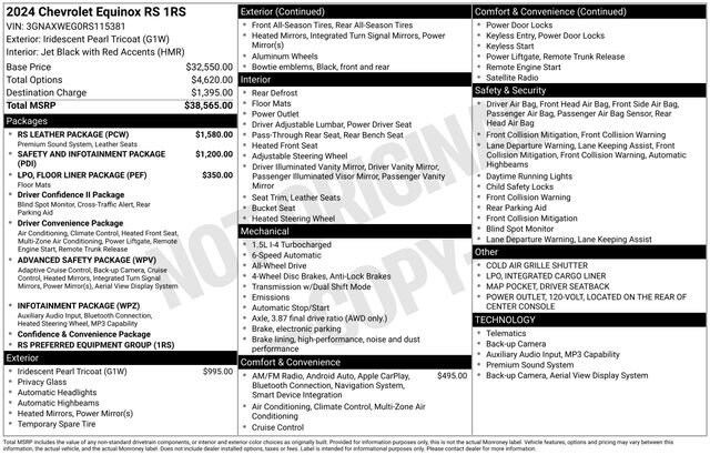 We Buy cars- Fast, Fair and Easy This 2024 Iridescent Pearl Tricoat Chevrolet Equinox RS AWD is well equipped and includes these features and benefits: Advanced Safety Package (Adaptive Cruise Control, HD Surround Vision, and Outside Heated Power-Adjustable Mirrors), Floor Liner Package (LPO) (All-Weather Floor Liners (LPO) and Integrated Cargo Liner (LPO)), Infotainment Package (120-Volt Power Outlet, 2 Rear USB Charging-Only Ports, 2 USB Data Ports, 2 USB Data Ports w/SD Card Reader, Bluetooth® For Phone, Heated Steering Wheel, Radio: Chevrolet Infotainment 3 Plus System, and SiriusXM), Preferred Equipment Group 1RS, RS Leather Package (Bose Premium 7-Speaker Audio System Feature, Driver Seatback Map Pocket, and Perforated Leather-Appointed Seat Trim), Safety & Infotainment Package, 19 Aluminum Wheels, 2 USB Ports & Auxiliary Input Jack, 2-Way Power Driver Lumbar Control Seat Adjuster, 3.87 Final Drive Axle Ratio, 4-Wheel Disc Brakes, 6 Speakers, 6-Speaker Audio System Feature, ABS brakes, Air Conditioning, Alloy wheels, AM/FM radio: SiriusXM, Auto High-beam Headlights, Automatic temperature control, Brake assist, Bumpers: body-color, Cold Air Grille Shutter, Compass, Delay-off headlights, Driver 8-Way Power Seat Adjuster, Driver door bin, Driver vanity mirror, Dual front impact airbags, Dual front side impact airbags, Electronic Stability Control, Emergency communication system: OnStar and Chevrolet connected services capable, Four wheel independent suspension, Front anti-roll bar, Front Bucket Seats, Front Center Armrest, Front dual zone A/C, Front Passenger 4-Way Manual Seat Adjuster, Front reading lights, Fully automatic headlights, Heated door mirrors, Heated Driver & Front Passenger Seats, Heated front seats, Illuminated entry, Low tire pressure warning, Occupant sensing airbag, Outside temperature display, Overhead airbag, Overhead console, Panic alarm, Passenger door bin, Passenger vanity mirror, Power door mirrors, Power driver seat, Power Liftgate, Power steering, Power windows, Premium audio system: Chevrolet Infotainment 3, Premium Cloth Seat Trim, Radio data system, Radio: Chevrolet Infotainment 3 Plus System w/Navi, Radio: Chevrolet Infotainment 3 System w/AM/FM, Rear anti-roll bar, Rear reading lights, Rear seat center armrest, Rear window defroster, Rear window wiper, Remote keyless entry, Roof rack: rails only, Security system, Speed control, Speed-sensing steering, Split folding rear seat, Spoiler, Steering wheel mounted audio controls, Tachometer, Telescoping steering wheel, Tilt steering wheel, Traction control, Trip computer, and Variably intermittent wipers.
