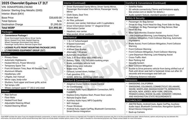We Buy cars- Fast, Fair and Easy This 2025 Sterling Gray Metallic Chevrolet Equinox LT AWD is well equipped and includes these features and benefits: Preferred Equipment Group 2LT, 3.47 Final Drive Axle Ratio, 4-Wheel Disc Brakes, 6 Speakers, ABS brakes, Air Conditioning, Alloy wheels, AM/FM radio: SiriusXM, Auto High-beam Headlights, Brake assist, Bumpers: body-color, Cloth Seat Trim, Compass, Delay-off headlights, Driver 6-Way Manual Seat Adjuster, Driver door bin, Driver vanity mirror, Dual front impact airbags, Dual front side impact airbags, Electronic Stability Control, Emergency communication system: OnStar and Chevrolet connected services capable, Four wheel independent suspension, Front anti-roll bar, Front Bucket Seats, Front Center Armrest, Front Passenger 4-Way Manual Seat Adjuster, Front reading lights, Fully automatic headlights, Heated door mirrors, Heated Driver & Front Passenger Seats, Heated front seats, Heated steering wheel, Illuminated entry, Low tire pressure warning, Navigation System, Occupant sensing airbag, Outside temperature display, Overhead airbag, Overhead console, Panic alarm, Passenger door bin, Passenger vanity mirror, Power door mirrors, Power steering, Power windows, Premium audio system: Chevrolet Infotainment 3, Radio data system, Radio: 11.3 Diagonal Advanced Color LCD Display, Rear anti-roll bar, Rear reading lights, Rear seat center armrest, Rear window defroster, Rear window wiper, Remote keyless entry, Security system, SiriusXM, Speed control, Speed-sensing steering, Split folding rear seat, Spoiler, Steering wheel mounted audio controls, Tachometer, Telescoping steering wheel, Tilt steering wheel, Traction control, Trip computer, Variably intermittent wipers, and Wheels: 17 Grazen Metallic Machined-Face Aluminum.