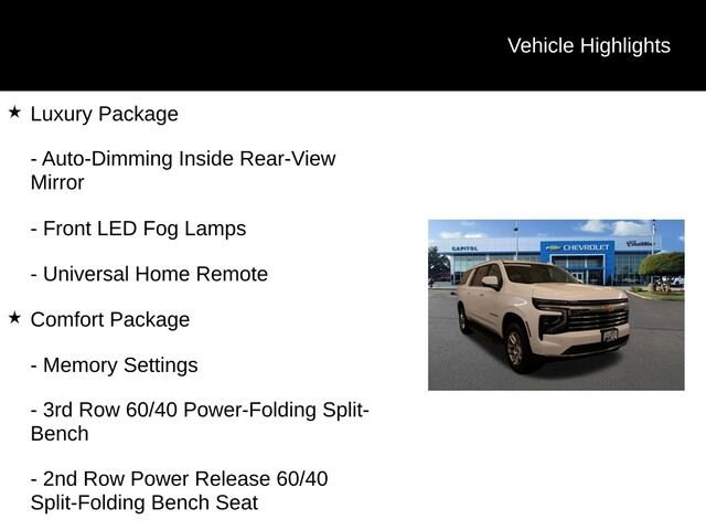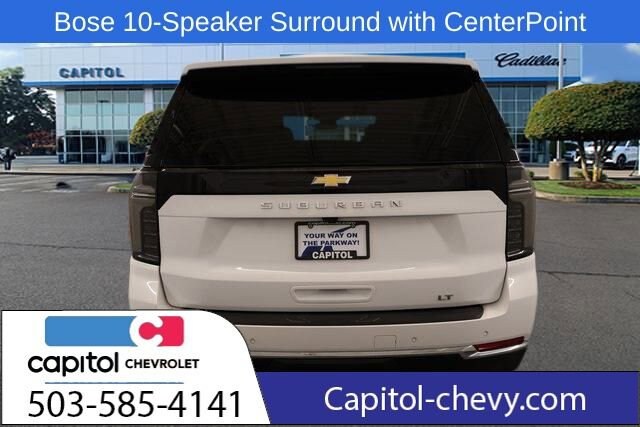We Buy cars- Fast, Fair and Easy This 2025 Summit White Chevrolet Suburban LT 4WD is well equipped and includes these features and benefits: Comfort Package (2nd Row Power Release 60/40 Split-Folding Bench Seat, 3rd Row 60/40 Power-Folding Split-Bench, Bose 10-Speaker Surround with CenterPoint, Heated 2nd Row Outboard Seats, Heated Power-Adjustable Outside Mirrors, Heated Steering Wheel, LED Headlamps with LED Daytime Running Lamps, LED Tail Lamps, and Memory Settings), Luxury Package (Auto-Dimming Inside Rear-View Mirror, Front LED Fog Lamps, and Universal Home Remote), 2-Way Driver Power Lumbar Seat Adjuster, 2-Way Front Passenger Power Lumbar Seat Adjuster, 3.23 Rear Axle Ratio, 3rd row seats: split-bench, 4-Wheel Disc Brakes, 6 Speakers, 6-Speaker Audio System, 8-Way Power Driver Seat Adjuster, 8-Way Power Front Passenger Seat Adjuster, ABS brakes, Air Conditioning, Alloy wheels, AM/FM radio: SiriusXM with 360L, Apple CarPlay/Android Auto, Auto High-beam Headlights, Automatic temperature control, Brake assist, Bumpers: body-color, Compass, Delay-off headlights, Driver door bin, Driver vanity mirror, Dual front impact airbags, Dual front side impact airbags, Electronic Stability Control, Emergency communication system: OnStar Services capable, Exterior Parking Camera Rear, Four wheel independent suspension, Front anti-roll bar, Front Bucket Seats, Front Center Armrest, Front dual zone A/C, Front reading lights, Fully automatic headlights, Heated door mirrors, Heated Driver and Front Passenger Seats, Heated front seats, Illuminated entry, Leather-Appointed Seating, Low tire pressure warning, Memory seat, Memory Settings For Driver, Navigation system: Google built-in compatibility (select service plan required, terms and limitations apply), Occupant sensing airbag, Outside temperature display, Overhead airbag, Overhead console, Panic alarm, Passenger door bin, Passenger vanity mirror, Power door mirrors, Power driver seat, Power Liftgate, Power passenger seat, Power steering, Power windows, Premium Smooth Ride Suspension, Radio data system, Radio: 17.7 Diagonal Advanced Color LCD Display, Rain sensing wipers, Rear air conditioning, Rear anti-roll bar, Rear Power Liftgate, Rear reading lights, Rear seat center armrest, Rear window defroster, Rear window wiper, Remote keyless entry, Security system, SiriusXM with 360L Trial Subscription, Speed control, Speed-sensing steering, Split folding rear seat, Spoiler, Steering wheel mounted audio controls, Tachometer, Telescoping steering wheel, Tilt steering wheel, Traction control, Trip computer, Variably intermittent wipers, Voltmeter, Wheels: 18 x 8.5 Bright Silver Painted Aluminum, Wireless Apple CarPlay/Wireless Android Auto, and Wireless Phone Charging.