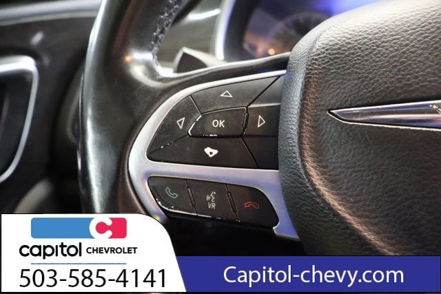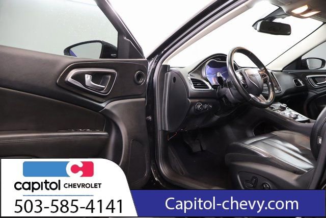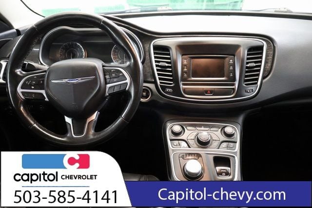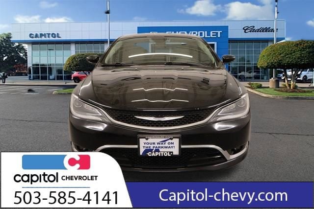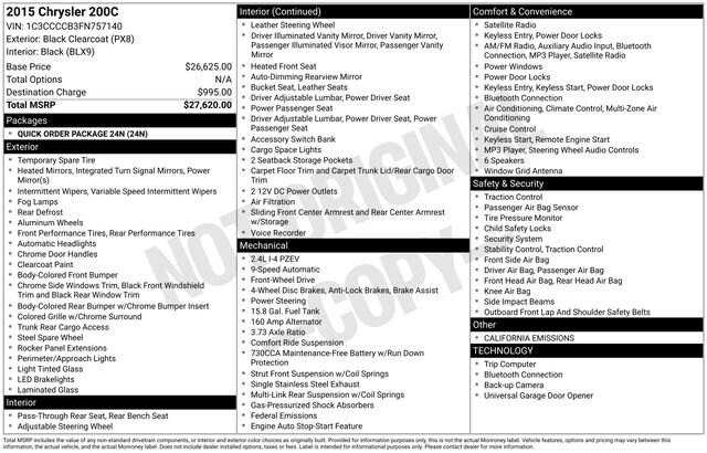 We Buy cars- Fast, Fair and Easy This 2015 Black Clearcoat Chrysler 200 C FWD is well equipped and includes these features and benefits: Quick Order Package 24N, 4-Wheel Disc Brakes, 6 Speakers, ABS brakes, Accessory Switch Bank, Air Conditioning, Alloy wheels, AM/FM radio: SiriusXM, Anti-whiplash front head restraints, Auto-dimming Rear-View mirror, Automatic temperature control, Brake assist, Bumpers: body-color, Compass, Delay-off headlights, Driver door bin, Driver vanity mirror, Dual front impact airbags, Dual front side impact airbags, Electronic Stability Control, Four wheel independent suspension, Front anti-roll bar, Front Bucket Seats, Front Center Armrest, Front dual zone A/C, Front fog lights, Front reading lights, Fully automatic headlights, Garage door transmitter, Heated door mirrors, Heated front seats, Illuminated entry, Integrated Voice Command w/Bluetooth, Knee airbag, Leather Trimmed Bucket Seats, Low tire pressure warning, Occupant sensing airbag, Outside temperature display, Overhead airbag, Overhead console, Panic alarm, ParkView Rear Back-Up Camera, Passenger door bin, Passenger vanity mirror, Power door mirrors, Power driver seat, Power passenger seat, Power steering, Power windows, Radio data system, Radio: Uconnect 5.0 AM/FM/BT, Rear anti-roll bar, Rear seat center armrest, Rear window defroster, Remote keyless entry, Security system, SIRIUSXM Satellite Radio, Speed control, Speed-sensing steering, Speed-Sensitive Wipers, Split folding rear seat, Steering wheel mounted audio controls, Tachometer, Telescoping steering wheel, Tilt steering wheel, Traction control, Trip computer, Turn signal indicator mirrors, Uconnect Voice Command w/Bluetooth, Variably intermittent wipers, and Wheels: 17 x 7.5 Satin Silver Aluminum.