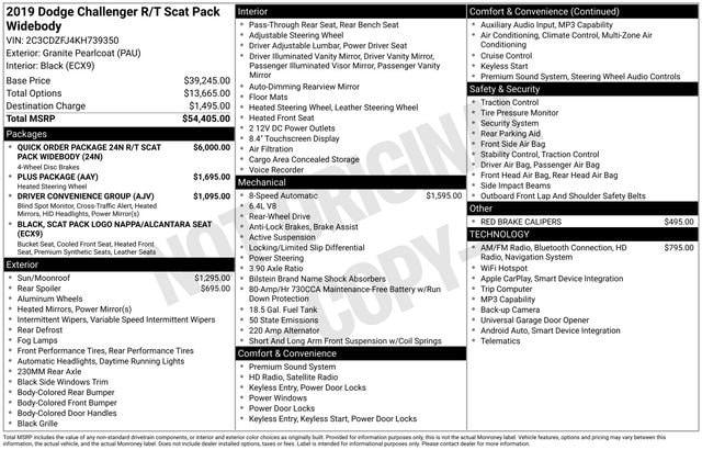 We Buy cars- Fast, Fair and Easy This 2019 Granite Crystal Metallic Clearcoat Dodge Challenger R/T Scat Pack Widebody RWD is well equipped and includes these features and benefits: Driver Convenience Group (Power Multi-Function Foldaway Mirrors), Plus Package (Door Trim Panel w/Ambient Lighting), Quick Order Package 24N R/T Scat Pack Widebody (3.09 Rear Axle Ratio), Apple CarPlay/Android Auto, Fully automatic headlights, Heated front seats, ParkView Rear Back-Up Camera, Power Sunroof, 1-Yr SiriusXM Guardian Trial, 230MM Rear Axle, 4-Wheel Disc Brakes, 4G LTE Wi-Fi Hot Spot, 6 Speakers, 8.4 Touchscreen Display, ABS brakes, Air Conditioning, Alloy wheels, AM/FM radio: SiriusXM, Anti-whiplash front head restraints, Apple CarPlay, Auto-dimming Rear-View mirror, Automatic temperature control, Brake assist, Bumpers: body-color, Center Rear 3-Point Seat Belt, Child Seat Upper Tether Anchorages, Compass, Delay-off headlights, Driver door bin, Driver vanity mirror, Dual front impact airbags, Dual front side impact airbags, Electronic Stability Control, Emergency communication system: SiriusXM Guardian, Four wheel independent suspension, Front anti-roll bar, Front Bucket Seats, Front Center Armrest, Front dual zone A/C, Front fog lights, Front Passenger Seat, Front Passenger Seat Belt Alert, Front reading lights, Garage door transmitter, Google Android Auto, GPS Antenna Input, GPS Navigation, HD Radio, Heated door mirrors, Heated steering wheel, Illuminated entry, Integrated Center Stack Radio, Integrated Voice Command w/Bluetooth, Leather Shift Knob, Low tire pressure warning, Media Hub (2 USB, AUX), Outside temperature display, Overhead airbag, Overhead console, Panic alarm, Passenger door bin, Passenger vanity mirror, Power door mirrors, Power driver seat, Power steering, Power windows, Radio data system, Radio: Uconnect 4C w/8.4 Display, Rear anti-roll bar, Rear reading lights, Rear seat center armrest, Rear window defroster, Red Brake Calipers, Remote keyless entry, Rhombi 2-Pc Wheel Center Cap, Scat Pack Logo Houndstooth Seat, Security system, SiriusXM Satellite Radio, SiriusXM Traffic Plus, SiriusXM Travel Link, Speed control, Speed-sensing steering, Split folding rear seat, Spoiler, Sport steering wheel, SRT Performance Spoiler, Steering wheel mounted audio controls, Tachometer, Telescoping steering wheel, Tilt steering wheel, Traction control, Trip computer, Uconnect 4C Nav w/8.4 Display, USB Host Flip, Variably intermittent wipers, and Wheels: 20 x 9.0 Black Noise.