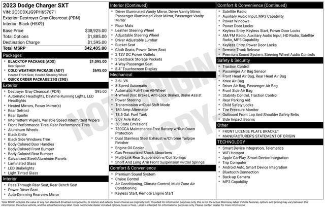 We Buy cars- Fast, Fair and Easy This 2023 Destroyer Gray Clearcoat Dodge Charger SXT AWD is well equipped and includes these features and benefits: Blacktop Package (AWD Rhombi Black Badge, Black 1-Piece Performance Spoiler, Dodge Grille Badge, Gloss Black I/P Cluster Trim Rings, Satin Black Charger Decklid Badge, and Satin Black Dodge Tail Lamp Badge), Cold Weather Package (Heated Front Seats and Heated Steering Wheel), Quick Order Package 29G, Apple CarPlay/Android Auto, Fully automatic headlights, ParkView Rear Back-Up Camera, 1-Yr SiriusXM Guardian Trial, 2-Piece Shark Fin Antenna, 4-Wheel Disc Brakes, 4G LTE Wi-Fi Hot Spot, 6 Speakers, 8.4 Touchscreen Display, ABS brakes, Air Conditioning, Alloy wheels, AM/FM radio: SiriusXM, Anti-whiplash front head restraints, Apple CarPlay, Auto-dimming Rear-View mirror, Automatic temperature control, Brake assist, Bumpers: body-color, Compass, Delay-off headlights, Driver & Passenger Lower LED Lamps, Driver door bin, Driver vanity mirror, Dual front impact airbags, Dual front side impact airbags, Electronic Stability Control, Emergency communication system: SiriusXM Guardian, For Details, Visit DriveUconnect.com, Four wheel independent suspension, Front anti-roll bar, Front Bucket Seats, Front Center Armrest, Front dual zone A/C, Front License Plate Bracket, Front reading lights, Google Android Auto, GPS Antenna Input, HD Radio, Heated door mirrors, Houndstooth Cloth Sport Seat, Illuminated entry, Integrated Center Stack Radio, Integrated Voice Command w/Bluetooth, Knee airbag, Leather Shift Knob, Low tire pressure warning, Manufacturer's Statement of Origin, Media Hub (2 USB, AUX), Occupant sensing airbag, Outside temperature display, Overhead airbag, Overhead console, Panic alarm, Passenger door bin, Passenger vanity mirror, Power 2-Way Driver Lumbar Adjust, Power door mirrors, Power driver seat, Power steering, Power windows, Radio: Uconnect 4C w/8.4 Display, Rear anti-roll bar, Rear Armrest w/Cupholder Seat, Rear reading lights, Rear seat center armrest, Rear window defroster, Remote keyless entry, Speed control, Speed-Sensitive Wipers, Split folding rear seat, Spoiler, Steering wheel mounted audio controls, Tachometer, Telescoping steering wheel, Tilt steering wheel, Traction control, Trip computer, USB Host Flip, Variably intermittent wipers, Wheels: 19 x 7.5 Black Noise Painted, and Wheels: 19 x 7.5 Satin CarboN.