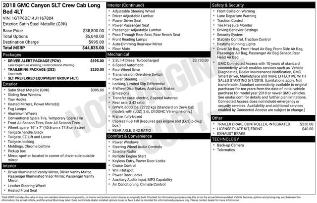 We Buy cars- Fast, Fair and Easy This 2018 Satin Steel Metallic GMC Canyon SLT 4WD is well equipped and includes these features and benefits: Driver Alert Package (Forward Collision Alert and Lane Departure Warning System), Preferred Equipment Group 4LT (Tow/Haul Mode and Trailering Assist Guideline Hitch Guidance), Trailering Package, 3.42 Rear Axle Ratio, 4-Way Power Front Passenger Seat Adjuster, 4-Wheel Disc Brakes, 6 Speakers, ABS brakes, Air Conditioning, Alloy wheels, AM/FM radio: SiriusXM, Auto-dimming Rear-View mirror, Automatic temperature control, Bumpers: body-color, Compass, Delay-off headlights, Driver 4-Way Power Seat Adjuster, Driver door bin, Driver vanity mirror, Dual front impact airbags, Dual front side impact airbags, Electronic Stability Control, Exhaust Brake, Exterior Parking Camera Rear, Front anti-roll bar, Front Bucket Seats, Front Center Armrest, Front fog lights, Front License Plate Kit, Front reading lights, Front wheel independent suspension, Fully automatic headlights, Heated door mirrors, Heated Driver & Front Passenger Seats, Heated front seats, Illuminated entry, Integrated Trailer Brake Controller, Leather-Appointed Seat Trim, Low tire pressure warning, Occupant sensing airbag, Outside temperature display, Overhead airbag, Overhead console, Panic alarm, Passenger door bin, Passenger vanity mirror, Power door mirrors, Power Driver Lumbar Control Seat Adjuster, Power driver seat, Power Passenger Lumbar Control Seat Adjuster, Power passenger seat, Power steering, Power windows, Premium audio system: GMC Infotainment System, Radio data system, Radio: AM/FM Stereo w/8 Color Touch Screen, Rear reading lights, Rear seat center armrest, Rear step bumper, Rear window defroster, Remote keyless entry, Security system, SiriusXM Satellite Radio, Speed control, Speed-sensing steering, Steering wheel mounted audio controls, Tachometer, Telescoping steering wheel, Tilt steering wheel, Traction control, Trip computer, Variably intermittent wipers, and Wheels: 18 x 8.5 Polished Cast Aluminum.
