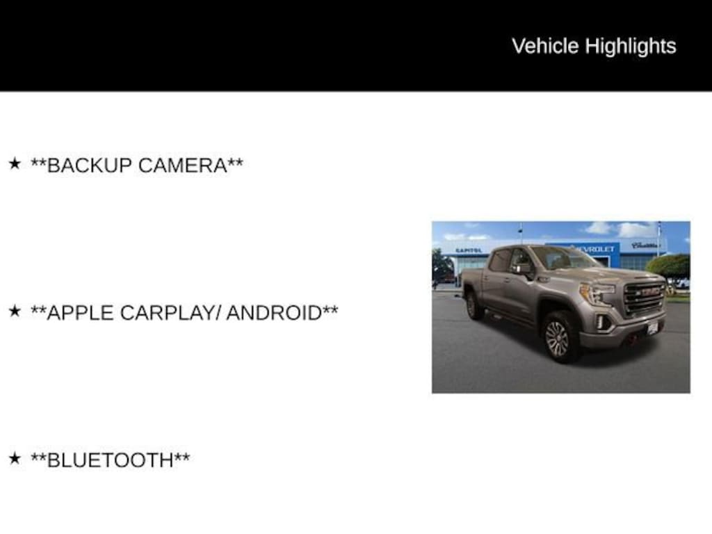 We Buy cars- Fast, Fair and Easy This 2021 Satin Steel Metallic GMC Sierra 1500 AT4 4WD is well equipped and includes these features and benefits: Preferred Equipment Group 4SB (12-Volt Rear Auxiliary Power Outlet, 120-Volt Bed Mounted Power Outlet, 120-Volt Instrument Panel Power Outlet, 170 Amp Alternator, 2 USB Ports, 2 USB Ports (1st Row), 4.2 Diagonal Color Display Driver Info Center, 4G LTE Wi-Fi Hotspot Capable, Auto-Locking Rear Differential, Auxiliary External Transmission Oil Cooler, Body-Color Surround Grille, Color-Keyed Carpeting Floor Covering, Compass, Deep-Tinted Glass, Electric Rear-Window Defogger, Electrical Lock Control Steering Column, Floor-Mounted Center Console, Front Prem Floor Liners w/Removable Carpet Insert, GMC Connected Access Capable, HD Rear Vision Camera, Heated Driver & Front Outboard Passenger Seating, Heavy-Duty Air Filter, Hill Descent Control, Hitch Guidance w/Hitch View, In-Vehicle Trailering App, Integrated Trailer Brake Controller, Keyless Open & Start, LED Cargo Area Lighting, Manual Tilt-Wheel & Telescoping Steering Column, OnStar & GMC Connected Services Capable, Power Door Locks, Power Front Passenger Windows w/Express Up/Down, Power Front Windows w/Driver Express Up/Down, Power Rear Windows w/Express Down, ProGrade Trailering System, Rear Dual USB Charging-Only Ports, Rear Prem Floor Liners w/Removable Carpet Insert, Rear Wheelhouse Liners, Red Recovery Hooks, Remote Vehicle Starter System, Spray-On Pickup Bed Liner w/AT4 Logo, Steering Wheel Audio Controls, Theft Deterrent System (Unauthorized Entry), and Ventilated Driver & Front Passenger Seats), Trailering Package (Hitch Guidance), 10-Way Power Driver Seat Adjuster w/Lumbar, 10-Way Power Passenger Seat Adjuster w/Lumbar, 18 x 8.5 Machined Aluminum Wheels, 3.23 Rear Axle Ratio, 4-Wheel Disc Brakes, 6 Speakers, 6-Speaker Audio System Feature, ABS brakes, Air Conditioning, Alloy wheels, AM/FM radio: SiriusXM with 360L, Apple CarPlay/Android Auto, Auto-dimming door mirrors, Auto-dimming Rear-View mirror, Automatic temperature control, Brake assist, Bumpers: body-color, Delay-off headlights, Driver door bin, Driver Memory, Driver vanity mirror, Dual front impact airbags, Dual front side impact airbags, Electronic Stability Control, Front anti-roll bar, Front Bucket Seats, Front Center Armrest, Front dual zone A/C, Front fog lights, Front License Plate Kit, Front reading lights, Front wheel independent suspension, Fully automatic headlights, Heated 2nd Row Outboard Seats, Heated door mirrors, Heated front seats, Heated steering wheel, Illuminated entry, Low tire pressure warning, Memory seat, Occupant sensing airbag, Off-Road Suspension, Outside temperature display, Overhead airbag, Overhead console, Panic alarm, Passenger door bin, Passenger vanity mirror, Perforated Leather-Appointed Front Seat Trim, Power door mirrors, Power driver seat, Power passenger seat, Power steering, Power windows, Premium audio system: GMC Infotainment System, Radio data system, Radio: Premium GMC Infotainment Sys w/Multi-Touch, Rear reading lights, Rear seat center armrest, Rear step bumper, Rear window defroster, Remote keyless entry, Security system, SiriusXM w/360L, Speed control, Speed-sensing steering, Split folding rear seat, Steering wheel mounted audio controls, Tachometer, Telescoping steering wheel, Tilt steering wheel, Traction control, Trip computer, Variably intermittent wipers, Ventilated front seats, and Voltmeter.