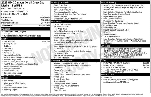 We Buy cars- Fast, Fair and Easy This 2023 Summit White GMC Canyon Denali 4WD is well equipped and includes these features and benefits: Preferred Equipment Group 5SB (120-Volt Bed Mounted Power Outlet, 2 Rear USB Ports in Center Console (Charge-Only), 5 Rectangular Chrome Assist Steps, 6-Way Power Passenger Seat Adjuster, 8-Way Power Driver Seat Adjuster, Adaptive Cruise Control, Automatic Emergency Braking, Automatic Locking Rear Differential, Blind Zone Steering Assist, Canyon Pro Safety, Driver & Front Passenger Illuminated Visors, Driver & Front Passenger Ventilated Seats, Driver Memory, Driver Seatback Map Pocket, Dual-Zone Automatic Air Conditioning, EZ-Lift & Lower Tailgate, Following Distance Indicator, Forward Collision Alert, Front LED Fog Lamps, Front Pedestrian & Bicyclist Braking, HD Surround Vision, Heated Driver & Front Passenger Seats, Heated Power-Adjustable Outside Mirrors, Heated Steering Wheel, Inside Rear-View Auto-Dimming Mirror, IntelliBeam Automatic High Beam On/Off, Interior Overhead Courtesy Light w/Dual Reading Lamp, Lane Keep Assist w/Lane Departure Warning, Manual Rear-Sliding Window, Multicolor 6.3 Diagonal Head-Up Display, MultiStow Tailgate, Power Driver Lumbar Control Seat Adjuster, Power Passenger Lumbar Control Seat Adjuster, Premium 7-Speaker Bose Sound System, Rear Center Fold-Down Armrest w/2 Cupholders, Rear Cross Traffic Braking, Rear of Console 120-Volt Power Outlet, Rear Pedestrian Alert, Rear-Window Electric Defogger, Remote Vehicle Starter System, Safety Alert Seat, Spray-On Bedliner, Tailgate Keyed Cylinder Lock, Tilt & Telescopic Manual Steering Column, Ultrasonic Rear Park Assist, and Wireless Charging), ProGrade Trailering System (Trailering App System), Trailering Package (Integrated Trailer Brake Controller), 2 1st Row USB Charge/Data Ports, 220 Amps Alternator, 3.42 Rear Axle Ratio, 4-Wheel Disc Brakes, 7 Speakers, ABS brakes, Air Conditioning, Alloy wheels, AM/FM radio: SiriusXM, Apple CarPlay/Android Auto, Auto High-beam Headlights, Auto-dimming Rear-View mirror, Automatic Stop/Start, Automatic temperature control, Brake assist, Bumpers: body-color, Compass, Delay-off headlights, Driver door bin, Driver Mode Selector, Driver vanity mirror, Dual front impact airbags, Dual front side impact airbags, Electronic Stability Control, Front anti-roll bar, Front Bucket Seats, Front Center Armrest, Front dual zone A/C, Front fog lights, Front License Plate Kit, Front Passenger Seatback Map Pocket, Front reading lights, Front wheel independent suspension, Genuine wood dashboard insert, Genuine wood door panel insert, Heads-Up Display, Heated door mirrors, Heated front seats, Heated steering wheel, Illuminated entry, Low tire pressure warning, Memory seat, Navigation System, Occupant sensing airbag, Outside temperature display, Overhead airbag, Overhead console, Panic alarm, Passenger door bin, Passenger vanity mirror, Perforated Leather-Appointed Seat Trim, Power door mirrors, Power driver seat, Power Inner Sliding Glass Sunroof w/Manual Shade, Power passenger seat, Power steering, Power windows, Radio data system, Radio: 11.3 Diagonal Premium GMC Infotainment Sys, Rear reading lights, Rear seat center armrest, Rear step bumper, Rear window defroster, Remote keyless entry, Security system, SiriusXM w/360L, Speed control, Speed-sensing steering, Split folding rear seat, Steering wheel mounted audio controls, Stop/Start System Disable Button Engine Co