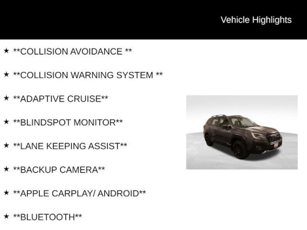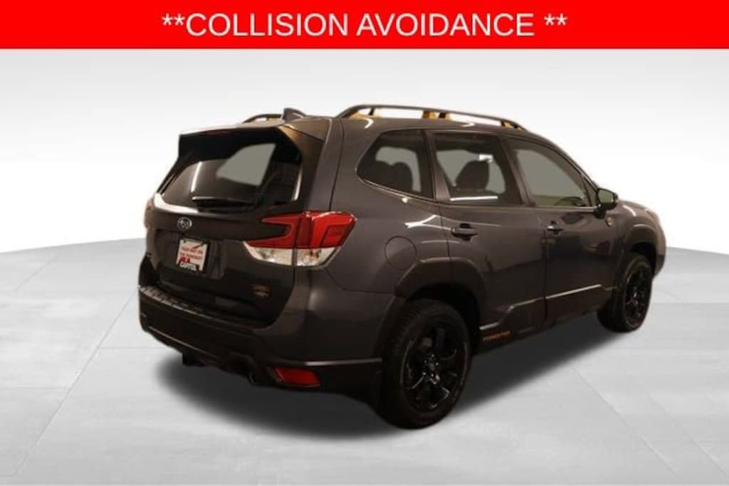We Buy cars- Fast, Fair and Easy This 2022 Magnetite Gray Metallic Subaru Forester Wilderness AWD is well equipped and includes these features and benefits: 4-Wheel Disc Brakes, 4.11 Axle Ratio, 6 Speakers, ABS brakes, Air Conditioning, Alloy wheels, AM/FM radio: SiriusXM, Anti-whiplash front head restraints, Auto High-beam Headlights, Automatic temperature control, Brake assist, Bumpers: body-color, CD player, Driver door bin, Driver vanity mirror, Dual front impact airbags, Dual front side impact airbags, Electronic Stability Control, Emergency communication system: STARLINK Safety and Security (Subscription Required), Exterior Parking Camera Rear, Four wheel independent suspension, Front anti-roll bar, Front Bucket Seats, Front Center Armrest, Front dual zone A/C, Front fog lights, Front reading lights, Fully automatic headlights, Heated door mirrors, Heated Front Bucket Seats, Heated front seats, Illuminated entry, Knee airbag, Leather Shift Knob, Low tire pressure warning, Occupant sensing airbag, Outside temperature display, Overhead airbag, Overhead console, Panic alarm, Passenger door bin, Passenger vanity mirror, Power door mirrors, Power driver seat, Power moonroof: Panoramic, Power steering, Power windows, Radio data system, Radio: Subaru Starlink 8.0 Multimedia Plus System, Rear anti-roll bar, Rear seat center armrest, Rear window defroster, Rear window wiper, Remote keyless entry, Roof rack: rails only, Security system, Speed control, Speed-sensing steering, Split folding rear seat, Spoiler, STARLINK/Apple CarPlay/Android Auto, Steering wheel mounted audio controls, Tachometer, Telescoping steering wheel, Textured StarTex Upholstery, Tilt steering wheel, Traction control, Trip computer, Turn signal indicator mirrors, Variably intermittent wipers, and Wheels: 17 x 7.0J Matte Black Machine Finish Alloy.