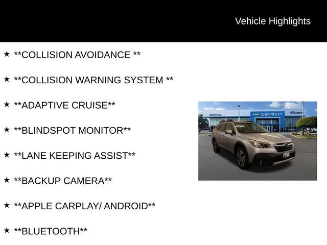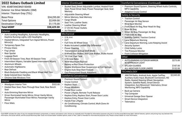 We Buy cars- Fast, Fair and Easy This 2022 Ice Silver Metallic Subaru Outback Limited AWD is well equipped and includes these features and benefits: Power Moonroof & HSW & Navigation System (DriverFocus (Driver Monitoring System), Heated Steering Wheel, Power Moonroof, and Radio: Subaru STARLINK 11.6 Multimedia Nav System), 12 Speakers, 3.90 Axle Ratio, 4-Wheel Disc Brakes, ABS brakes, Air Conditioning, All-Weather Floor Liners, Alloy wheels, AM/FM radio: SiriusXM, Auto High-beam Headlights, Auto-Dimming Exterior Mirror w/Approach Light, Auto-dimming Rear-View mirror, Automatic temperature control, Brake assist, Bumpers: body-color, Compass, Driver door bin, Driver vanity mirror, Dual front impact airbags, Dual front side impact airbags, Electronic Stability Control, Emergency communication system: STARLINK Safety and Security (Subscription Required), Exterior Parking Camera Rear, Four wheel independent suspension, Front anti-roll bar, Front Bucket Seats, Front Center Armrest w/Storage, Front dual zone A/C, Front fog lights, Front reading lights, Fully automatic headlights, Garage door transmitter: HomeLink, harman/kardon® Speakers, Heated door mirrors, Heated Front Bucket Seats, Heated front seats, Heated rear seats, Illuminated entry, Knee airbag, Leather steering wheel, Low tire pressure warning, Memory seat, Occupant sensing airbag, Outside temperature display, Overhead airbag, Overhead console, Panic alarm, Passenger door bin, Passenger vanity mirror, Perforated Leather-Trimmed Upholstery, Power door mirrors, Power driver seat, Power Liftgate, Power passenger seat, Power steering, Power windows, Radio: Subaru STARLINK 11.6 Multimedia Plus Sys, Rear anti-roll bar, Rear seat center armrest, Rear window defroster, Rear window wiper, Remote keyless entry, Roof rack, Security system, Speed control, Speed-sensing steering, Splash Guards, Split folding rear seat, Spoiler, STARLINK/Apple CarPlay/Android Auto, Steering wheel mounted audio controls, Steering Wheel Paddle Shift Control Switches, Tachometer, Telescoping steering wheel, Tilt steering wheel, Traction control, Trip computer, Turn signal indicator mirrors, Variably intermittent wipers, Wheels: 18 x 7J Black Aluminum Alloy, and Woodgrain Interior Trim Kit.
