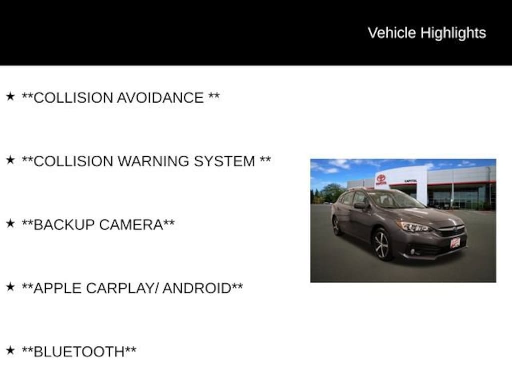 We Buy cars- Fast, Fair and Easy This 2023 Magnetite Gray Metallic Subaru Impreza Premium AWD is well equipped and includes these features and benefits: BSD/RCTA & Moonrf & Keyless Access & Pwr Dr. Seat (6-Way Power Driver's Seat, Blind Spot Detection (BSD), Dual-Illuminated Visor Vanity Mirror, Keyless Access w/Push-Button Start, Power Moonroof, and Rear Cross-Traffic Alert (RCTA) System), 4-Wheel Disc Brakes, 6 Speakers, ABS brakes, Air Conditioning, Alloy wheels, AM/FM radio: SiriusXM, Anti-whiplash front head restraints, Auto-Dimming Exterior Mirror w/Approach Light, Auto-Dimming Mirror w/Compass & HomeLink, Brake assist, Bumpers: body-color, CD player, Cloth Upholstery, Delay-off headlights, Driver door bin, Driver vanity mirror, Dual front impact airbags, Dual front side impact airbags, Electronic Stability Control, Emergency communication system, Exterior Parking Camera Rear, Four wheel independent suspension, Front anti-roll bar, Front Bucket Seats, Front Center Armrest, Front fog lights, Front reading lights, Fully automatic headlights, Heated door mirrors, Heated Front Bucket Seats, Heated front seats, Illuminated entry, Knee airbag, Low tire pressure warning, Occupant sensing airbag, Outside temperature display, Overhead airbag, Overhead console, Panic alarm, Passenger door bin, Passenger vanity mirror, Power door mirrors, Power steering, Power windows, Radio data system, Radio: Subaru STARLINK 6.5 Multimedia Plus System, Rear anti-roll bar, Rear window defroster, Rear window wiper, Remote keyless entry, Security system, Speed control, Speed-sensing steering, Split folding rear seat, Spoiler, STARLINK/Apple CarPlay/Android Auto, Steering wheel mounted audio controls, Tachometer, Telescoping steering wheel, Tilt steering wheel, Traction control, Trip computer, Variably intermittent wipers, and Wheels: 16 x 6.5 Machine Finish J Aluminum-Alloy.