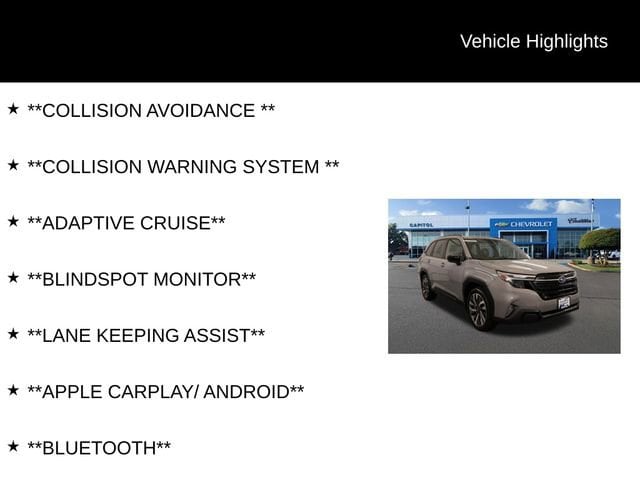 We Buy cars- Fast, Fair and Easy This 2025 River Rock Pearl Subaru Forester Touring AWD is well equipped and includes these features and benefits: Standard Model, 11 Speakers, 4-Wheel Disc Brakes, ABS brakes, Air Conditioning, Alloy wheels, AM/FM radio: SiriusXM with 360L, Anti-whiplash front head restraints, Auto High-beam Headlights, Automatic temperature control, Brake assist, Bumpers: body-color, Driver door bin, Driver vanity mirror, Dual front impact airbags, Dual front side impact airbags, Electronic Stability Control, Emergency communication system: MySubaru Safety (3-year free trial), Exterior Parking Camera Rear, Four wheel independent suspension, Front anti-roll bar, Front Bucket Seats, Front Center Armrest, Front dual zone A/C, Front fog lights, Front reading lights, Fully automatic headlights, harman/kardon® Speakers, Heated & Ventilated Front Bucket Seats, Heated door mirrors, Heated front seats, Heated rear seats, Heated steering wheel, HVAC memory, Illuminated entry, Knee airbag, Leather steering wheel, Low tire pressure warning, Memory seat, Navigation System, Occupant sensing airbag, Outside temperature display, Overhead airbag, Overhead console, Panic alarm, Passenger door bin, Passenger vanity mirror, Perforated Leather-Trimmed Upholstery, Power door mirrors, Power driver seat, Power Liftgate, Power moonroof: Panoramic, Power passenger seat, Power steering, Power windows, Radio data system, Radio: Subaru 11.6 Multimedia Navigation System, Rear anti-roll bar, Rear seat center armrest, Rear window defroster, Rear window wiper, Remote keyless entry, Security system, Speed control, Speed-sensing steering, Split folding rear seat, Spoiler, Steering wheel mounted audio controls, Tachometer, Telescoping steering wheel, Tilt steering wheel, Traction control, Trip computer, Turn signal indicator mirrors, Variably intermittent wipers, Ventilated front seats, and Wheels: 19 x 7.5 J Dark Gray Aluminum-Alloy.