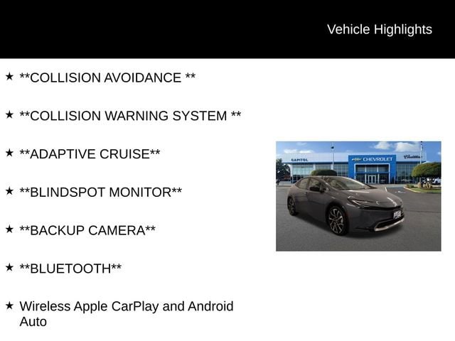 We Buy cars- Fast, Fair and Easy This 2025 Guardian Gray Toyota Prius Plug-In Hybrid XSE FWD is well equipped and includes these features and benefits: ABS brakes, Alloy wheels, Electronic Stability Control, Heated door mirrors, Illuminated entry, Low tire pressure warning, Remote keyless entry, Traction control, 4-Wheel Disc Brakes, Air Conditioning, AM/FM radio: SiriusXM, Apple CarPlay/Android Auto, Auto High-beam Headlights, Automatic temperature control, Brake assist, Bumpers: body-color, Delay-off headlights, Driver door bin, Driver vanity mirror, Dual front impact airbags, Dual front side impact airbags, Emergency communication system: Safety Connect (up to 10-year trial subscription), Exterior Parking Camera Rear, Four wheel independent suspension, Front anti-roll bar, Front Bucket Seats, Front Center Armrest, Front reading lights, Heated steering wheel, Navigation system: Drive Connect Cloud Navigation (1-year trial subscription), Occupant sensing airbag, Outside temperature display, Overhead airbag, Overhead console, Panic alarm, Passenger door bin, Passenger vanity mirror, Power door mirrors, Power steering, Power windows, Radio data system, Rain sensing wipers, Rear anti-roll bar, Rear reading lights, Rear side impact airbag, Rear window defroster, Speed control, Speed-Sensitive Wipers, Split folding rear seat, Steering wheel mounted audio controls, Telescoping steering wheel, Tilt steering wheel, Trip computer, and Variably intermittent wipers.